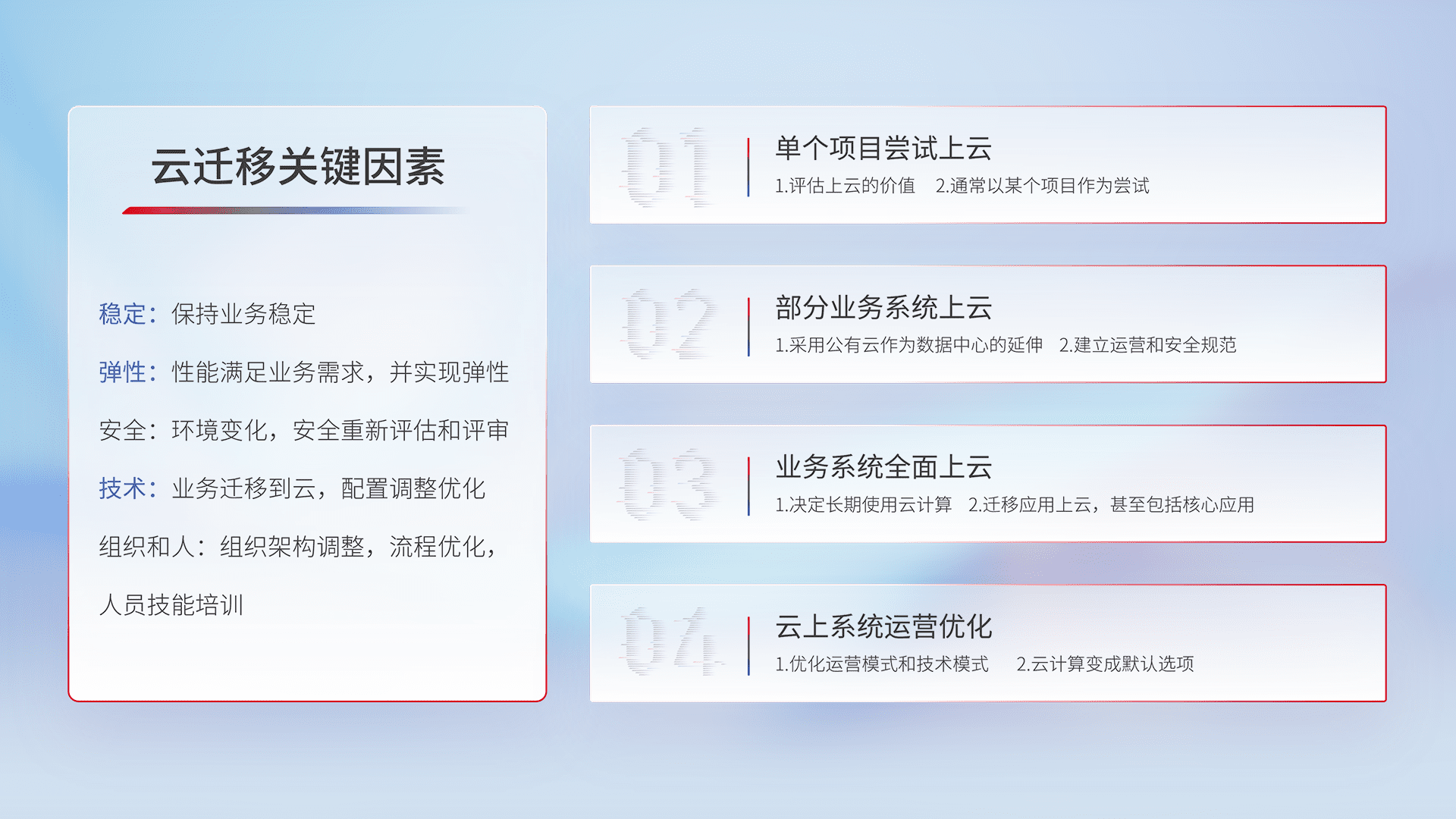 结合实际业务,,,,从规划设计、、、、云平台选型、、、云原生改造、、、、数据迁移、、、集成交付,,,迁移全过程为客户识别最佳上云路径,,做好风险识别管理,,,,设计网络架构、、、身份权限、、安全审计合规、、、、操作审计、、、、日志审计、、、、监控告警策略、、多站点容灾设计等,,对云上基础设施进行整体规划,,,,提升IT治理水平,,,以满足弹性、、、高可用、、、高性能的需求。。。